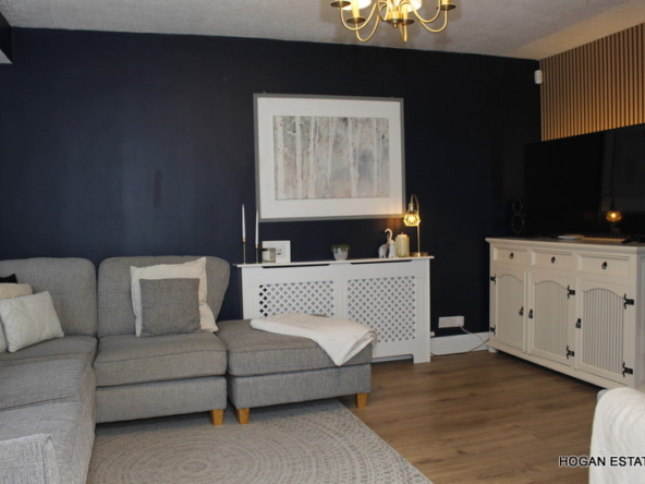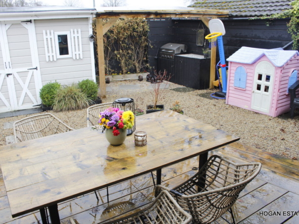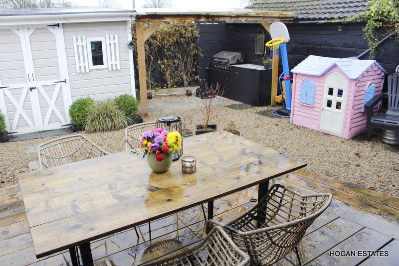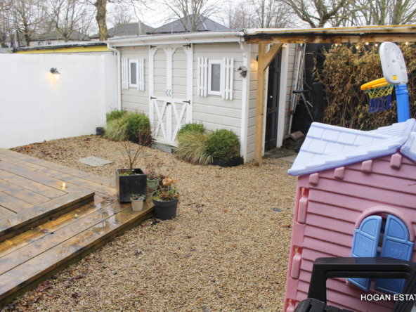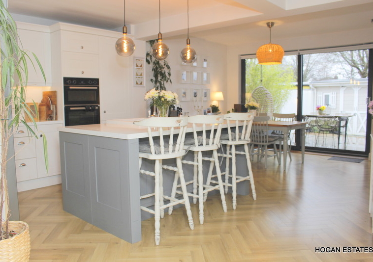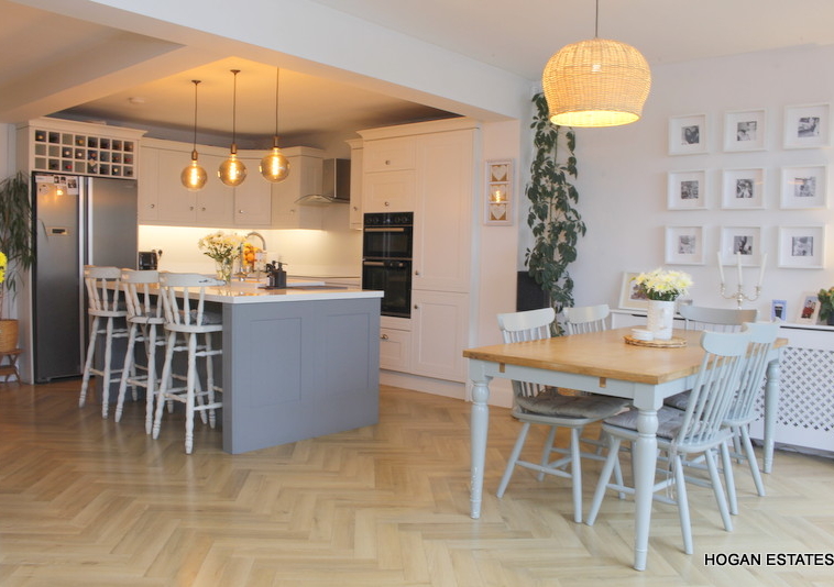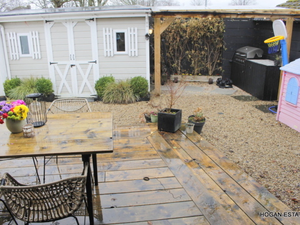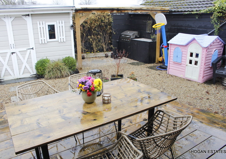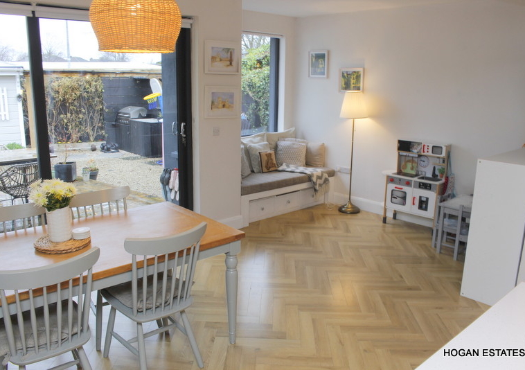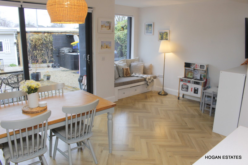 To the rear is the ever-popular open-plan kitchen, dining and living space, designed with both everyday living and entertaining in mind. The kitchen is exceptionally well fitted, offering excellent storage including a large pantry cupboard, a generous central island suitable for casual dining, and a Belfast-style sink. The parquet-style laminate flooring adds warmth and character, while the L-shaped layout cleverly zones the kitchen/dining area from the cosy living space, complete with a charming window seat overlooking the garden. Floor-to-ceiling doors flood the room with natural light and provide direct access to the low-maintenance, west-facing rear garden. The garden also benefits from a custom-built, block-built shed which is fully wired, and a covered outdoor kitchen area.
