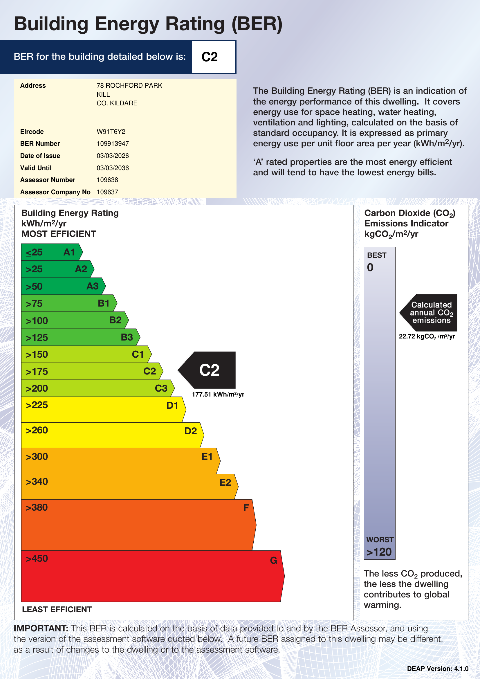 Welcome to Rochford Park, Kill – a superb two-bedroom, one-bathroom ground floor apartment extending to approximately 70 sq.m (c. 723 sq.ft), presented in excellent, move-in condition throughout. Built circa 2001, this bright and spacious own-door home is set within a secure gated development accessed via electric gates and surrounded by mature, landscaped gardens, offering privacy and peace of mind in a highly sought-after location.